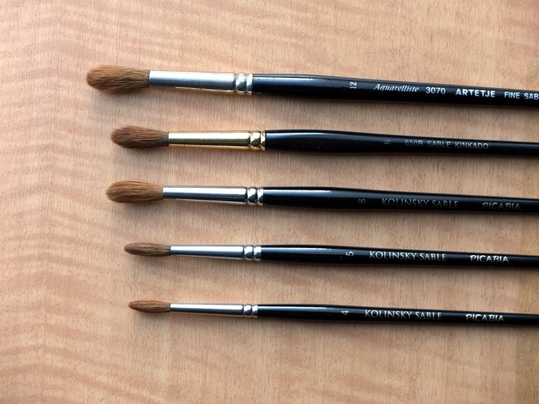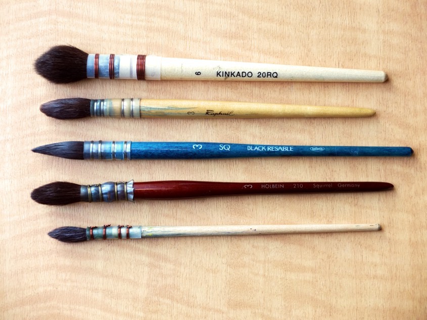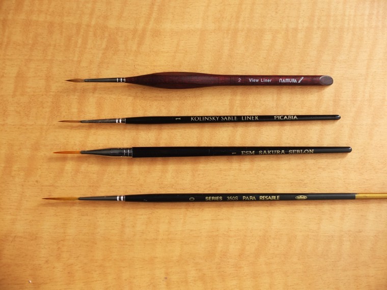 私はテンの毛で作った丸筆でコリンスキー、セーブル筆と呼ばれるものを使用。水の含みが良く、適度な腰があり、穂先もまとまっています。