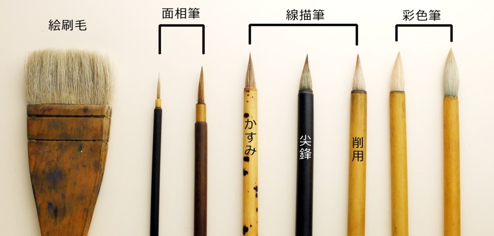 デザイン学校に通っていた時使っていたのはこの和筆、なのでなじみが深い。値段もそんなに高くないし、日本画用の筆ですが、水彩画の筆としても全く問題ありません。洋筆は一切使わず、和筆だけで描いている人も珍しくはありません。大きく分けて彩色筆、線描筆、面相筆があります。