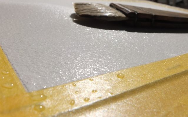 次にテープの糊面を上にし、刷毛かスポンジに水を含ませたらテープを滑らす様に素早く引きます。この時動かすのはテープの方で、刷毛やスポンジは固定しておくのがポイント!