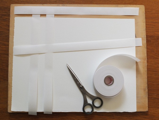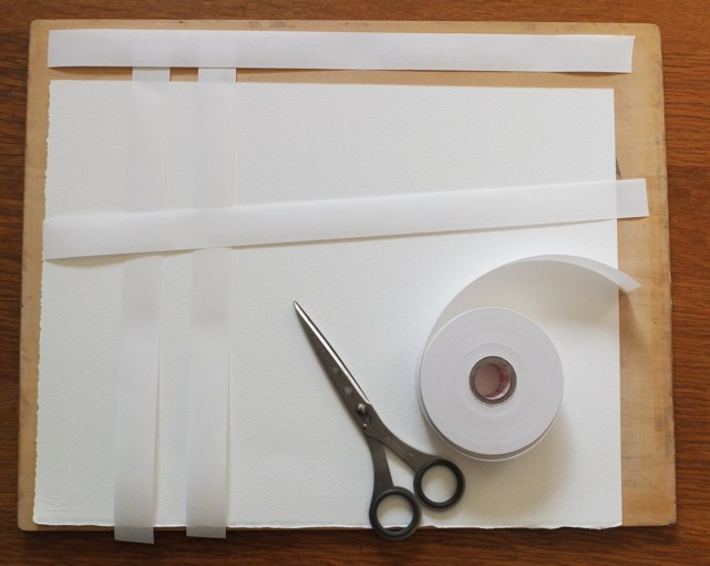 まず準備するのは、水張りしたい水彩紙、それより一回り大きい画板、水張りテープ、はさみ。