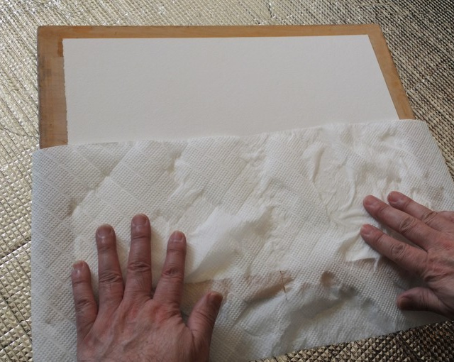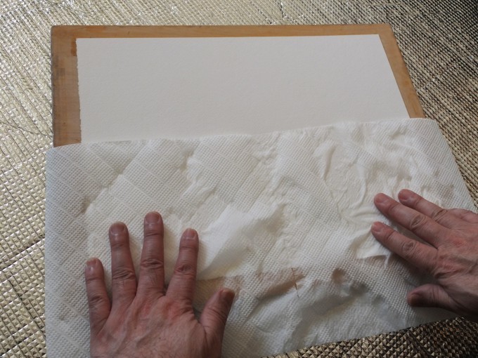 たらいから水彩紙をつまんで良く水を切ったら画板に乗せ、さらにキッチンペーパーなどで軽く押えて表面の水気を取ります。