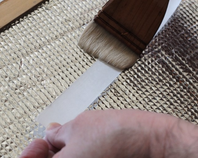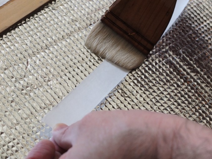 もっとも手早くやるのはココ。テープは必ず一辺貼る毎に湿らすようにしましょう。すぐカールしてきてしまうので、4辺とも湿らせてしまうと失敗します。始めに長辺方向から行い、次に短辺方向を貼ります。