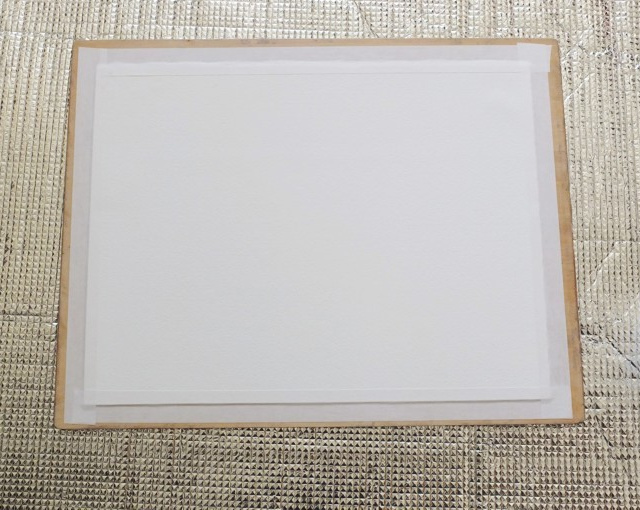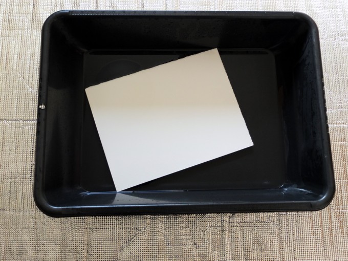 大きめのたらい、又は浴槽に水を張って(2~3cmもためれば十分)水彩紙の表、裏に水を馴染ませたら表を上にして5分ほどそのまま浮かべておく。