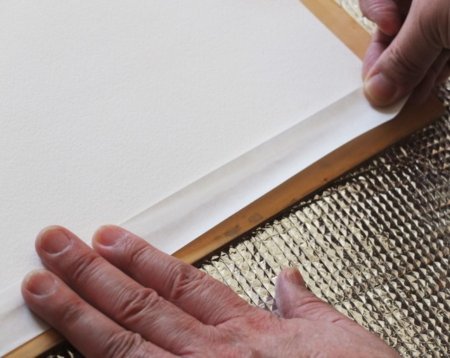 水彩紙の水張りは裏だけ湿らせて張るというのが定番ですが、表側にカールしてきて非常に張りにくい