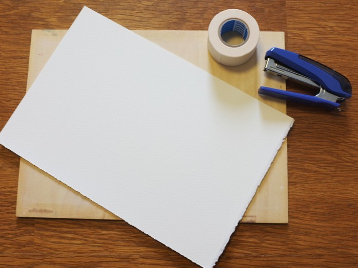 用意するのは水彩紙、画板、ホチキス又はタッカー、マスキングテープ。