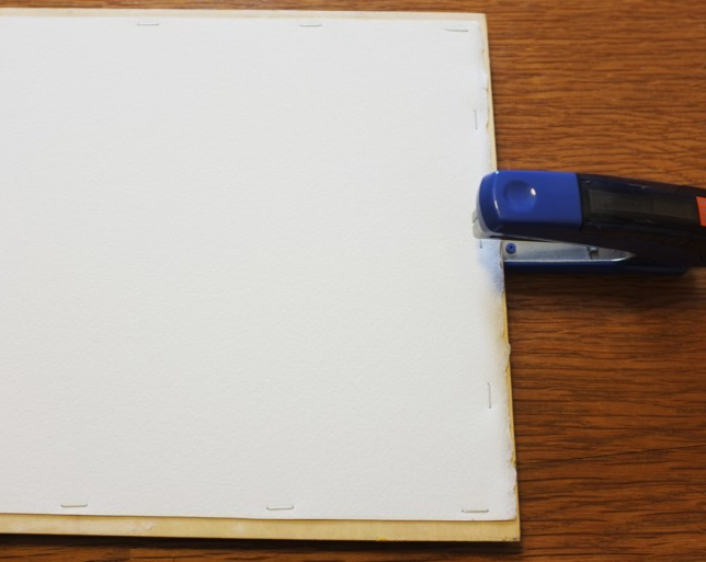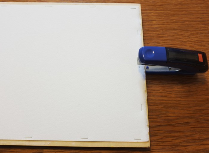 水張りテープの代わりにホチキスで止めてしまいます。間隔は5cmくらい。タッカーで止める場合は画板も針が飛び出ない様に厚めの物を使うか、パネルを使う。