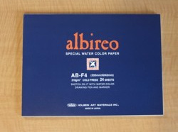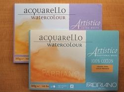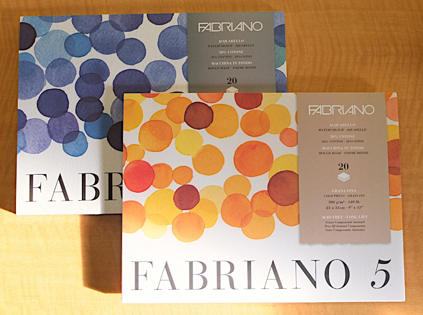 〈ファブリアーノ5〉クサカベ(代)。私がこれまで試した40種類の水彩紙の中でもっとも白い紙。以前クラシコ5という名の紙と名前が変わっただけ(というか代理店も変わった)という代理店の話だったが、白色度はこちらの方が白い。コットンの配合が50%でアルティスティコに比べると紙肌は柔らかでサイジングは弱め。滲みやボカシはきれいに出るが荒目の方はかなり荒い肌理となっている。マスキング液、テープ共OK。リフトは乾燥すると抜きにくくなる。ブロック紙は300g/㎡の20枚綴りで荒目と中目が有る。