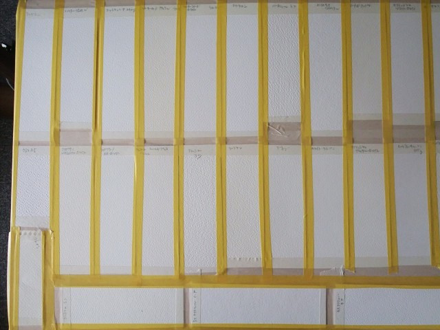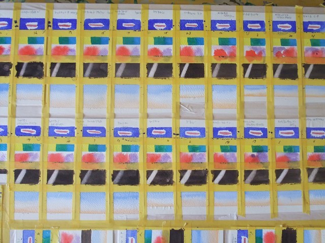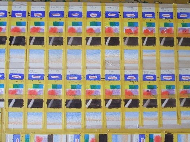 乾燥速度・・・ウルトラマリンとバーントシェンナの混合色を全紙並べて一気に塗り、同条件で乾燥速度をみる。