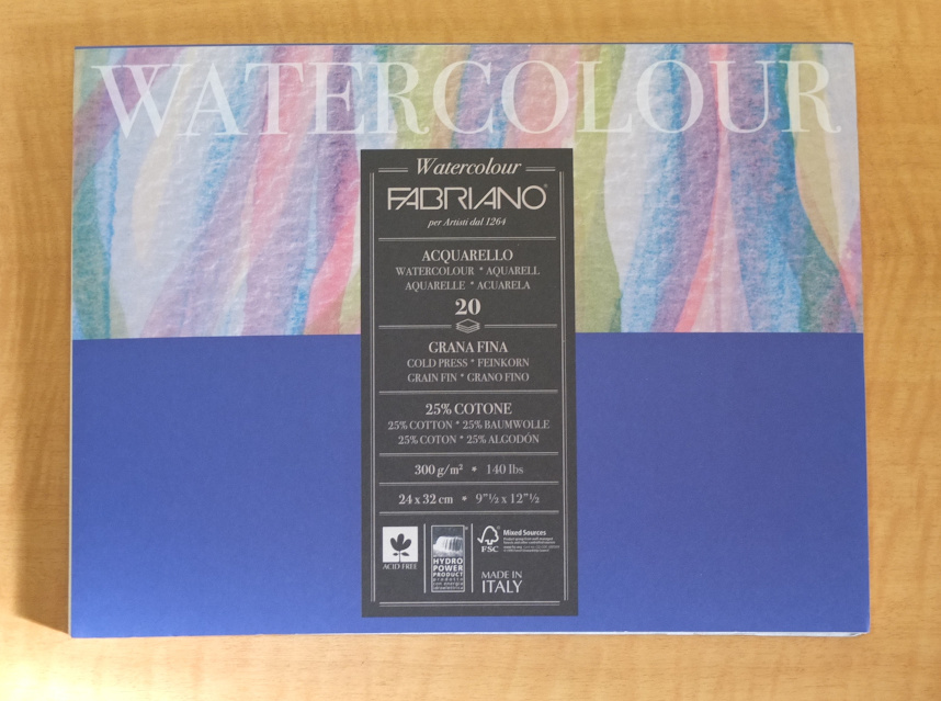 〈ファブリアーノ ウォーターカラー〉クサカベ(代)。無塩素漂白のパルプとコットン25%を配合した水彩紙。厚み300g/㎡、ハイホワイトの発色の良い紙。乾燥は早いので滲みやボカシのタイミングも早めが良さそう。サイジングは強く絵の具が紙の表面に留まる感じ。予め水刷毛で表面を馴染ませると描きやすくなる。マスキング液、テープ共OK。リフトは良く抜ける方。中目はブロックのみ、細目はパッドのみとなっている。