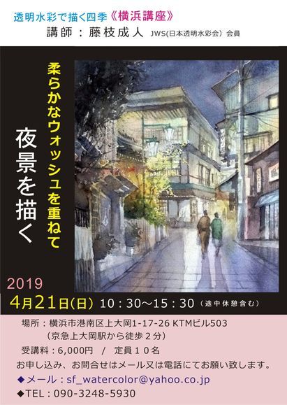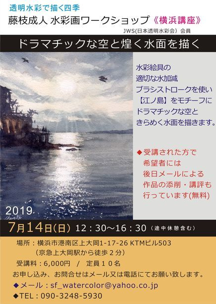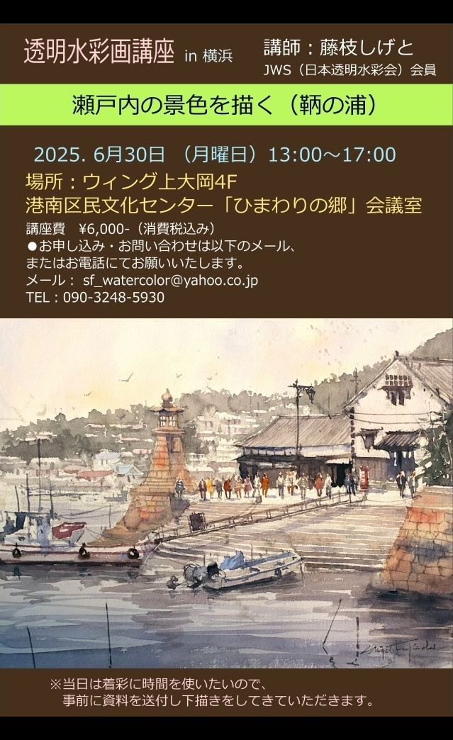 瀬戸内の静かな入り江、常夜灯、船、点景の人物など情緒あふれる風景を描きます。ウェットインウェットやドライブラシ、リフティングなどの技法を使って描いていきます。受講希望の方には前もってモチーフ写真と下描きガイドなどの資料を送付し、下描きをしてきて頂きます。当日は筆使い、絵具の濃度など講師のデモ、簡単な手順書を見ながら習得して頂けます。定員は16名となります。皆様のご参加お待ちしております!!