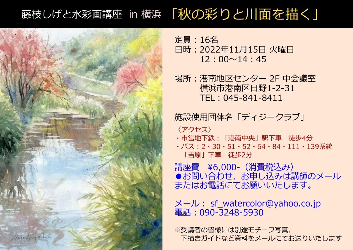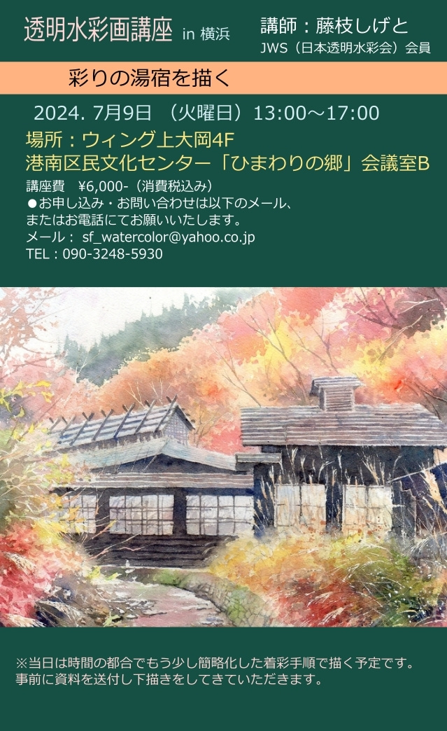 夏の暑い最中ですが、色付いた涼しげな秋の湯宿を描きます。ウェットインウェットやドライブラシ、リフティングなどの技法を使って描いていきます。筆使い、絵具の濃度など講師のデモ、簡単な手順書を見ながら習得して頂けます。皆様のご参加お待ちしております!。定員は9名となります。皆様のご参加お待ちしております(^^♪
