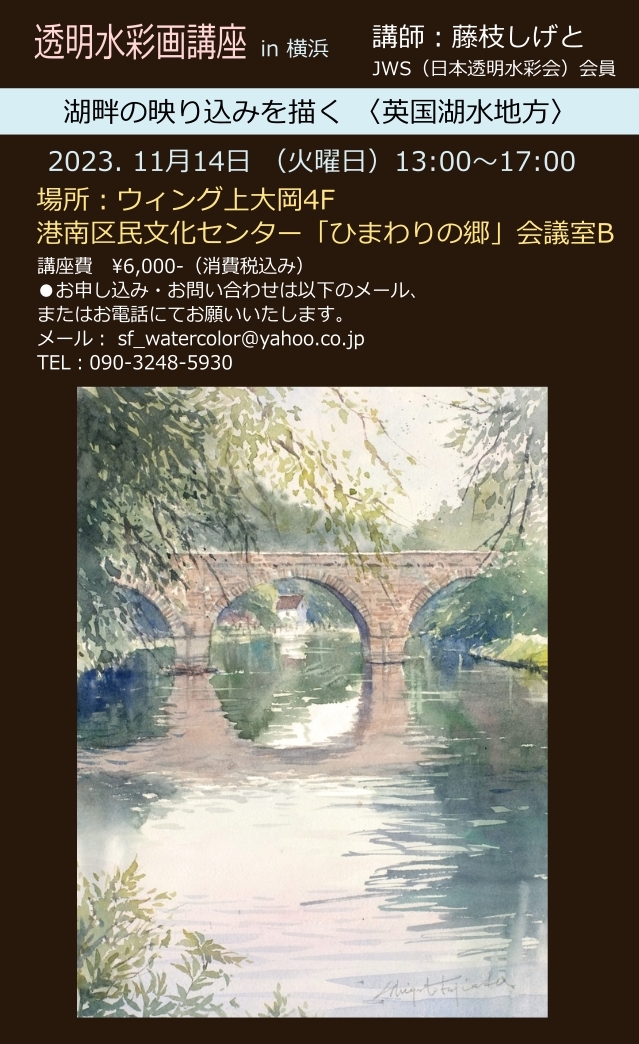 静かな湖面に反映する石橋や緑豊かな木々をウェットインウェットやドライブラシ、リフティングなどのお技法を使って描いていきます。筆使い、画面の湿り具合、絵具の濃度など講師のデモを見ながら習得して頂けます。定員は16名となります。皆様のご参加お待ちしております(^^♪